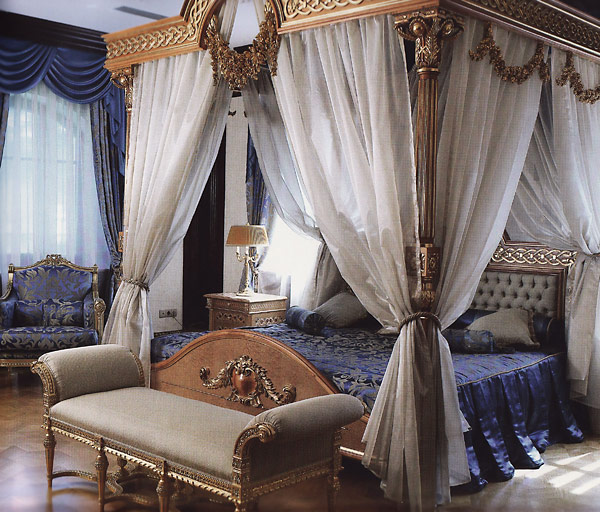 Массивные кровати с накладками рельефа из бронзы, изображались львиные лапы в отделки кроватей, по бокам стояли колонны, свисал балдахин.
